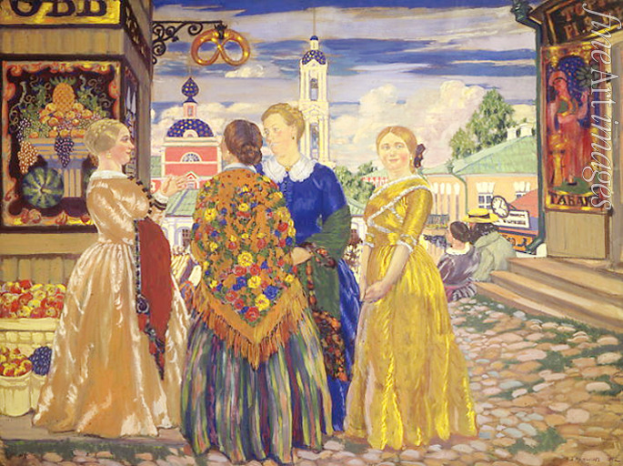 Dekorativ, Stadtbild, Straße, Gespräch, Damen, Häuser, Russland, Kirche, Frauen, Platz, Strassenszene, Alltag, Genreszene, Folklore, Brauchtum, Provinz, Stadtszene, Glockenturm, Kaufmannsfrauen, Marktfrauen