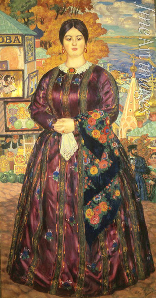 Dekorativ, Jahreszeiten, Stadtbild, Straße, Herbst, Dame, Frau, Am Ufer, Fluß, Häuser, Russland, Kirche, Platz, Alltag, Genreszene, Folklore, Brauchtum, Provinz, Marktfrau, Stadtszene, Glockenturm, Kaufmannsfrau, Wolga