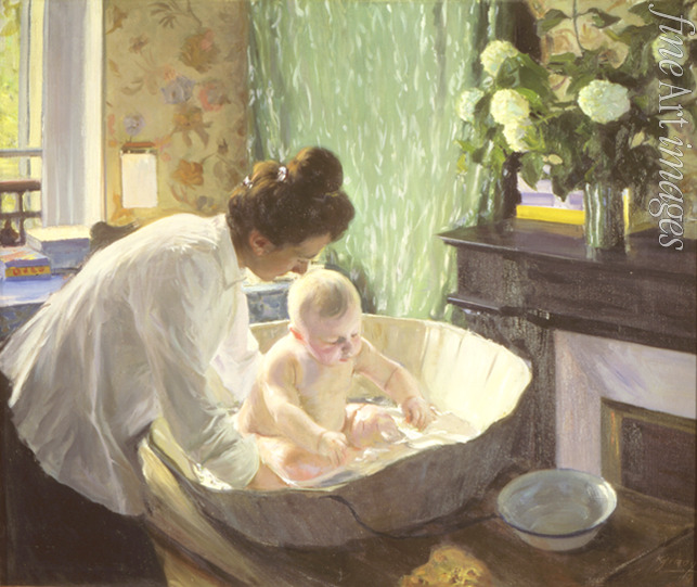 Blumen, Morgen, Licht, Tageszeiten, Baden, Glück, Russland, Zärtlichkeit, Mutterschaft, Mutterliebe, Mutter und Kind, Bad, Interieur, Familienleben, Kind, Schüssel, Blumenstrauss, Mutter, Alltag, Genreszene, Bouquet