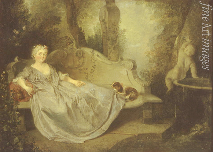 Frankreich, Dame, Frau, Hund, Rokoko, Frauenbildnis, Frauenporträt, Adel, Aristokratie, Skulptur, Dame im Garten, Gartenbank