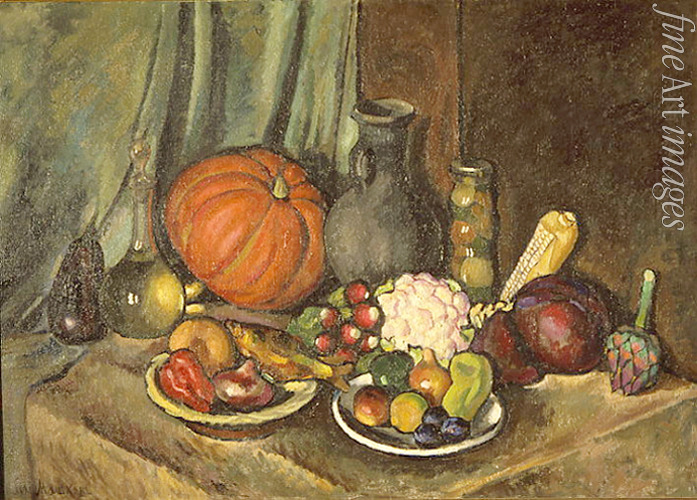 Farbigkeit, Am Tisch, Russland, Krug, Stilleben, Gemüse, Kochen, Kürbis, Russische Avantgarde, Zwiebel, Blumenkohl, Paprika, Radieschen, Rote Bete, Aubergine, Öl, Pflanzenöl, Mais, Schellbube, Karo-Bube