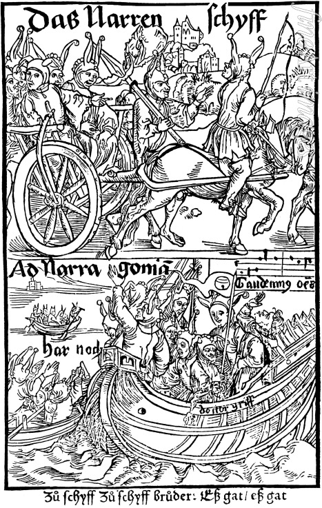 Satire, Schiff, Narr, Buchillustration, Bajazzo, Spassmacher, Halskrause, Brant, Spaßmacher, Schwarz-Weiß-Bild, Schwarz-Weiß, Narrenschiff, Sebastian Brant, Schwarzweiss, Narrheit, Narrheit der Menschen, Spottvogel, Spötter, Schalk, Schelm, Witzbold, Joker, Hanswurst, Kasper, Kasperl, Kasperle
