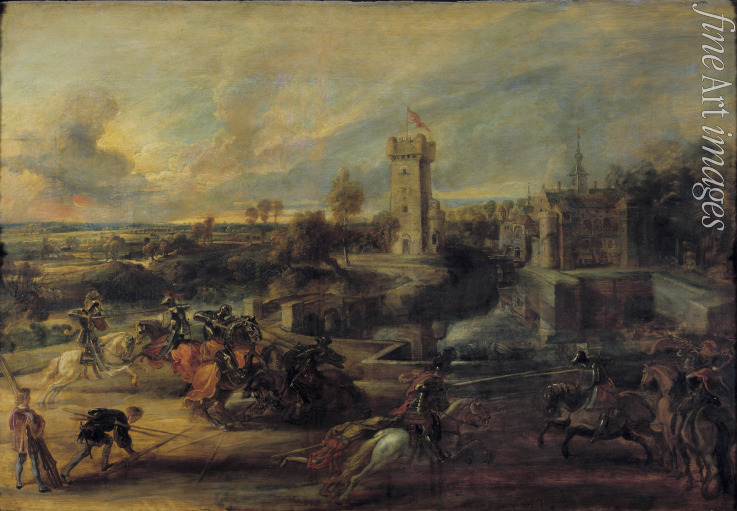 Jahreszeiten, Sommerlandschaft, Tageszeiten, Lichtwirkung, Abend, Barock, Palast, Palais, Schloss, Ritter, Landsitz, Mittelalter, Zweikampf, Turnier, Turnierzweikampf, Tjost, Tjosten, Lanzenstechen, Flämische Malerei, Het Steen, Schloss an der Schelde, Burg Steen, Ritterturnier