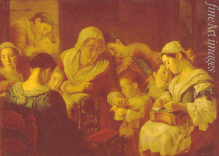 Kinder, Kind, Rokoko, Kindheit, Erziehung, Schule der Handarbeit, Handanfertigung, Schule, Pädagogin, Schüler, Schülerin, Erzieherin, Hauslehrerin, Basteln, Unterricht, Handarbeitsunterricht, Gouvernante