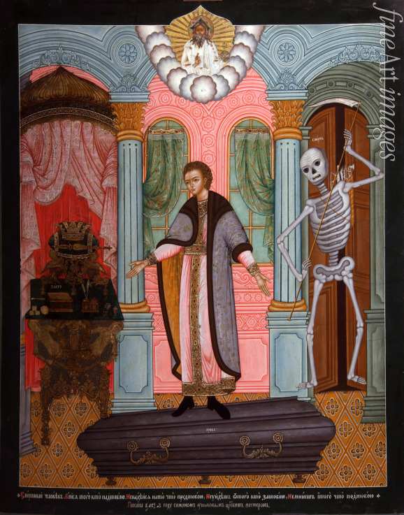 Tod, Ewigkeit, Ikone, Ikonenmalerei, Geld, Vanitas, Leben und Tod, Todessymbolik, Eitelkeit, Symbole, Eitel, Vergeblich, Vergänglich, Memento mori, Nichtigkeit, Menschlichkeit, Sündiger, Verschulden, Gier, Fülle, Orthodoxe Kirche, Russische Kirche, Christusbild, Gerechtigkeit, Reichtum, Wohlstand, Vermögensstand, Vermögen
