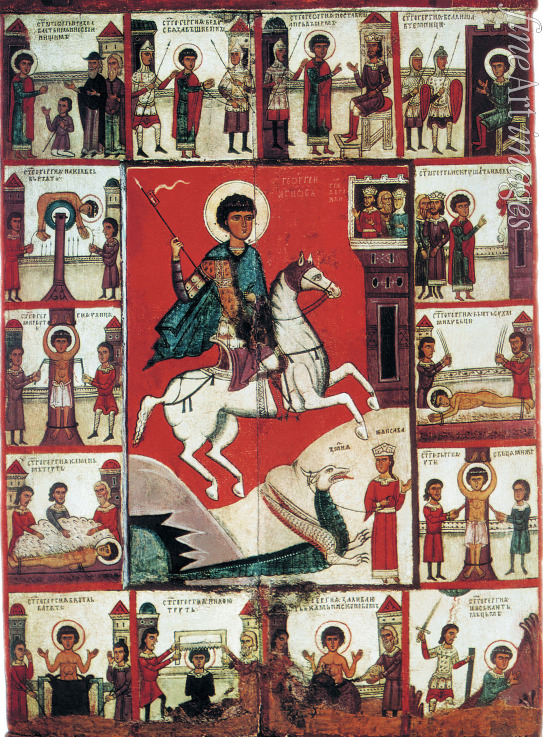 Ikone, Ikonenmalerei, Krieger, Märtyrer, Martyrium, Ritter, Heiliger, Heiligen, Gutes und Böses, Drachenwunder des heiligen Georg, Georg, Sankt Georg, Christliche Mythologie, Drache, Beschützer, Orthodoxe Kirche, Russische Kirche, Schutzheiliger, Schutzpatron, Heiliger Georg