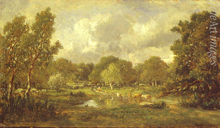 Frankreich, Natur, Jahreszeiten, Poesie, Bäume, Tal, Herbst, Wolken, Licht, Lichtwirkung, Wiese, Ländlich, Hügel, Vieh, Kuh, Kühe, Barbizon, Realismus, Waldrand, Ruhe, Friede, Tränke, Viehtränke, Wasserstelle, Stille, Kühe an der Tränke, Französische Malerei, Fontainebleau