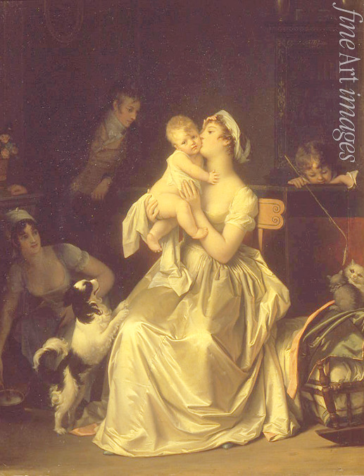 Frankreich, Poesie, Glück, Zärtlichkeit, Mutterschaft, Mutterliebe, Mutter und Kind, Interieur, Familienleben, Kind, Familie, Haustiere, Hund, Mutter, Alltag, Familienszene, Genreszene, Heim, Häusliches Leben, Katze