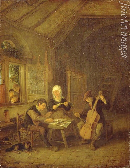 Dorf, Musik, Wanderleben, Landhaus, Musikinstrumente, Musikanten, Interieur, Barock, Hauskonzert, Konzert, Musiker, Musikant, Musizieren, Noten, Notenblätter, Partituren, Holland, Wandermusikant, Notenblatt, Dorfmusikanten, Cello, Cellist, Violoncello, Musikinstrument