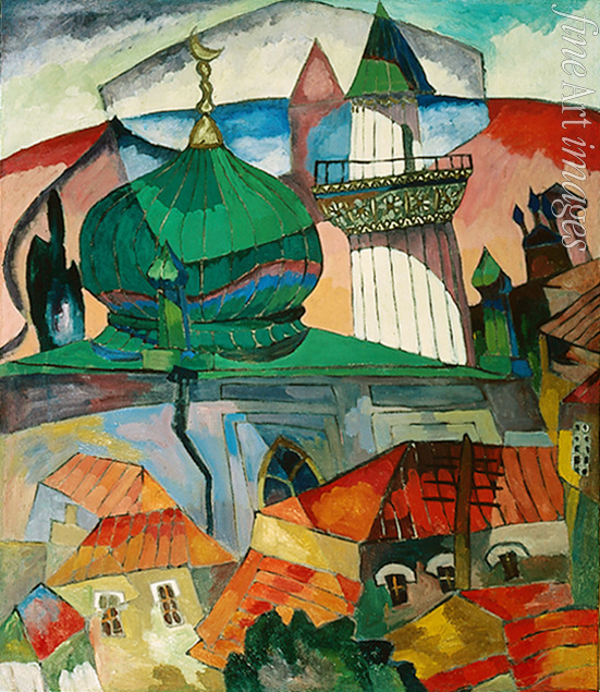 Dekorativ, Stadtbild, Facettierung, Moschee, Häuser, Russland, Kubismus, Rhythmus, Modern, Architektur, Russische Avantgarde, Orient, Islam, Zentralasien, Mittelasien, Orientalische Stadt, Schellbube, Karo-Bube