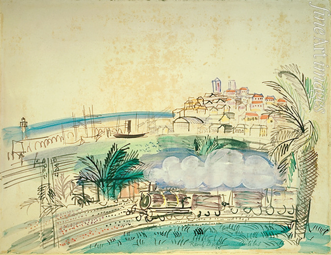 Sonne, Fauvismus, Frankreich, Natur, Poesie, Bäume, Tal, Meer, Meereslandschaft, Südfrankreich, Küste, Meeresküste, Bucht, Strand, Häuser, Hügel, Nabis, Reise, Aquarell, Bahn, Eisenbahn, Zug, Bahnsteig, Palmen, Städchen, Mittelmeer, Dampflokomotive, Eisenbahn in Antibes, Antibes, Côte d'Azur, Güterzug, Geschichte der Eisenbahn, Technikgeschichte, Verkehr, Verkehrsgeschichte, Triebfahrzeug, Bahnstrecke, Schienen, Dampflok, Bahnreise