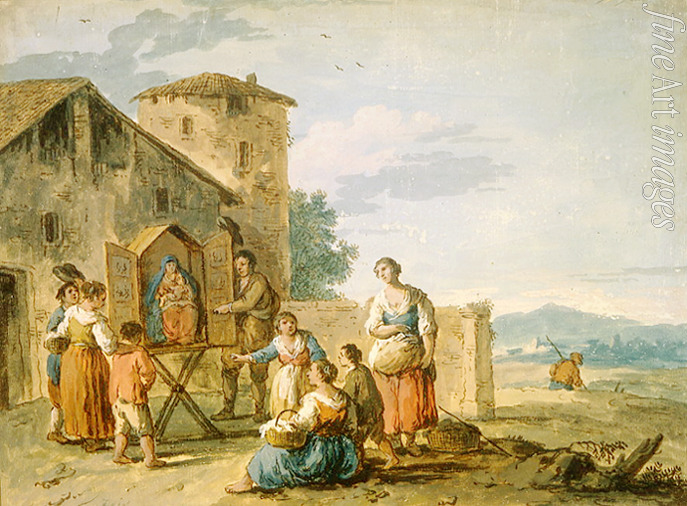 Bauern, Italien, Madonna, Bibel, Statue, Rokoko, Italienische Landschaft, Glaube, Katholische Kirche, Katholizismus, Zelt Gottes, Gläubigen, Hostie, Bauerngruppe vor dem Tabernakel mit der Madonna-Statue, Tabernakel, Madonna-Statue, Italienische Malerei, Marienbildnis