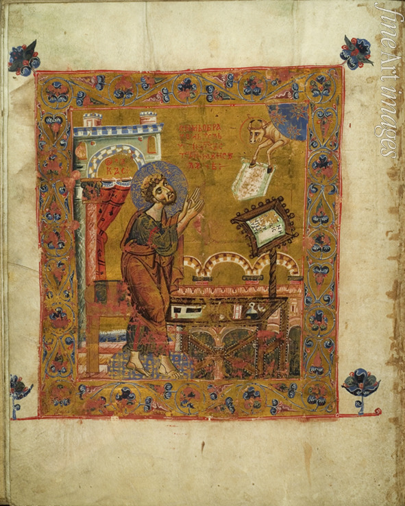 Russland, Ukraine, Bibel, Lukas, Neues Testament, Christentum, Staatsmann, Heiliger, Treue, Apostel, Russische Geschichte, Heiligen, Herrscher, Evangelist Lukas, Jesus Christus, Evangelien, Apostelgeschichte, Prophet, Orthodoxe Kirche, Russische Kirche, Jünger von Jesus, Kiewer Rus, Handschrift, Evangelist, Kiew, Mittelalter, Heilige Lukas, Rurikiden, Großfürst von Kiew, Altrussland, Kiewer Großfürst, Großfürst der Kiewer Rus, Buchmalerei, Heiliger Lukas der Evangelist, Manuskript, Bilderhandschrift, Mstislaw I., Mstislaw I. Wladimirowitsch, Mstislaw Wladimirowitsch:Mstislaw I. der Große, Mstislaw Codex, Aprakos-Evangelium, Mstislaw-Evangelium, Miniatur