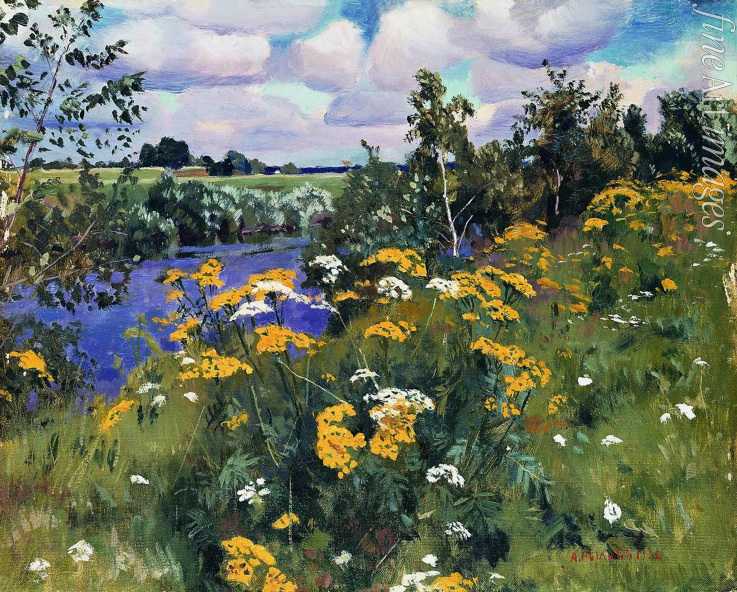 Sommer, Dorf, Natur, Jahreszeiten, Poesie, Morgen, Sonnenlicht, Sommerlandschaft, Hain, Bäume, Wolken, Licht, Farbigkeit, Tageszeiten, Am Ufer, Am Lande, Ländlich, Teich, Russland, Am Wasser, Weiher, Ruhe, Friede