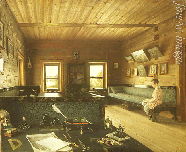 Am Tisch, Russland, Haus, Interieur, Familienleben, Kind, Rast, Buch, Alltag, Schreibzeug, Dose, Ruhe, Heim, Friede, Wohnen, Brief, Landsitz, Herrenhof, Lesen, Schreibblock, Schreibmappe, Schreibwaren, Tintenfass, Schreibtisch, Arbeitszimmer auf dem Landsitz in Ostrowki, Arbeitszimmer, Lesend, Gänsekiel, Federkiel, Gutshaus