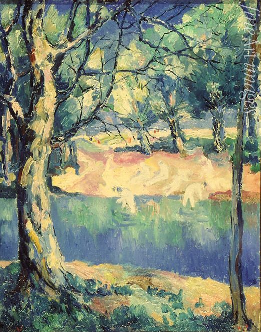 Sommer, Natur, Jahreszeiten, Poesie, Morgen, Sommerlandschaft, Bäume, Nackt, Nacktheit, Licht, Farbigkeit, Tageszeiten, Nackte Frau, Baden, Am Ufer, Fluß, Wald, Badende, Russland, Am Wasser, Russische Avantgarde, Fluß im Wald, Kubofuturismus