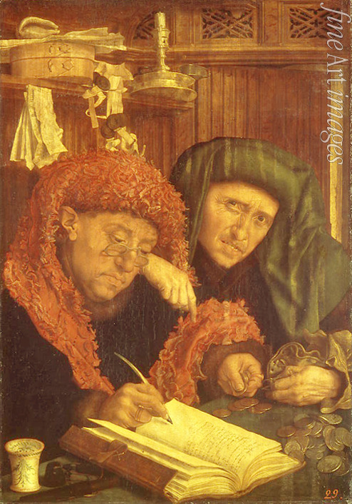 Am Tisch, Interieur, Renaissance, Bücher, Buch, Münzen, Geld, Schreibzeug, Dose, Gier, Macht, Fülle, Schreibfeder, Gänsefeder, Schreibwaren, Tintenfass, Schreibtisch, Steuereinnehmer, Steuer, Reichtum, Roejmerswaelen, Wohlstand, Vermögensstand, Vermögen, Steuereintreiber, Gänsekiel, Federkiel
