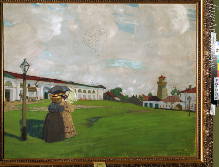 Dekorativ, Stadtbild, Straße, Dame, Frau, Häuser, Russland, Kirche, Platz, Spaziergang, Strassenszene, Alltag, Genreszene, Folklore, Brauchtum, Provinz, Regenguss, Regenschirm, Marktfrau, Stadtszene, Kaufmannsfrau, Schirm