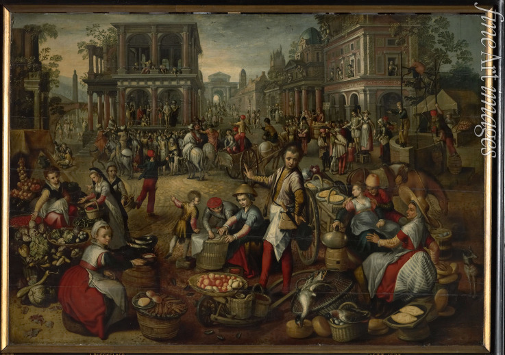 Stadtbild, Bauern, Bauernleben, Häuser, Bauer, Haus, Krug, Bibel, Landfrau, Bäuerin, Renaissance, Neues Testament, Brot, Auf dem Markt, Milchfrau, Handel, Verkäufer, Verkäuferin, Bauernmarkt, Hühner, Milch, Körbe, Fässe, Tracht, Städtchen, Christi, Christus, Alltag, Milchhändler, Bauernfamilie, Christentum, Jesus, Passion, Erdulden, Erleiden, Leiden und Sterben Jesu Christi, Ecce Homo, Passionsprozession, Kreuzweg, Christuspassion, Markt, Kreuz, Jerusalem, Provinz, Jesu, Christus im Leiden, Kruzifix, Golgatha, Strasse, Marktplatz, Bude, Marktbude, Kalvarienberg, Kreuztragung, Golgota, Kreuzigung, Der Weg zum Golgatha, Christusbild, Via Dolorosa, Golgotha, Leidensweg Jesu Christi, Leidender Christus, Schmerzensmann, Erbärmdebild, Mann der Schmerzen, Bild des Mitleids, Miserikordienbild