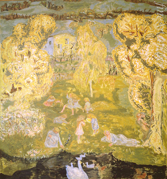 Dekorativ, Fauvismus, Frankreich, Dorf, Natur, Jahreszeiten, Poesie, Sonnenlicht, Bäume, Farbigkeit, Garten, Frühling, Blühen, Idyll, Liebe, Liebespaar, Schatten, Teich, Frühlingslandschaft, Familienleben, Nabis, Vorfrühling auf dem Lande, Kinder, Gänse, Belustigung