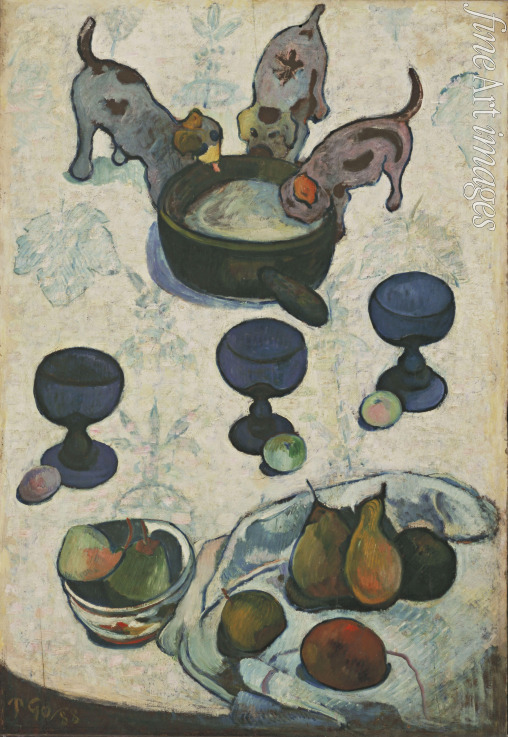 Cloisonismus, Sonnenlicht, Früchte, Impression, Teller, Auf dem Tisch, Hund, Birnen, Feigen, Birne, Impressionismus, Impressionisten, Welpe, Welpen