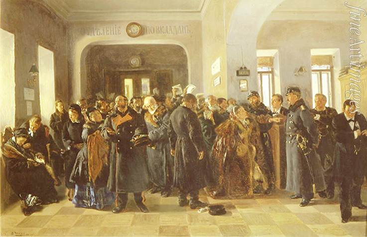 Russland, Interieur, Realismus, Geld, Wanderer, Genreszene, Gier, Unglück, Fülle, Bank, Peredwishniki-Bewegung, Bankrott einer Bank, Bankrott, Pleite, Ruin, Finanzkrise, Schulden, Pech, Reichtum, Peredwischniki, Wohlstand, Vermögensstand, Vermögen