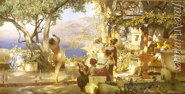 Natur, Poesie, Musik, Tanz, Nackt, Nacktheit, Mittag, Tageszeiten, Nackte Frau, Idyll, Schönheit, Musikinstrumente, Schwert, Musiker, Musikant, Musizieren, Palast, Romantische Landschaft, Blick, Italienische Landschaft, Antike Rom, Lyra, Antike Landschaft, Harfenspielerin, Harfenistin, Harfe, Tänzerin, Tanz zwischen den Schwerter, Antike Villa, Patrizier, Harfenspiel, Harfenspieler, Harfenist, Schwertertanz, Musikinstrument, Harfner, Harfnerinnen