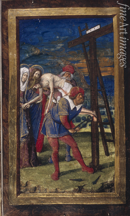 Bibel, Renaissance, Neues Testament, Maria, Christi, Christus, Maria Magdalena, Christentum, Jesus, Passion, Kreuzweg, Kreuz, Jerusalem, Kreuzabnahme, Leichnam Christi, Josef von Arimathia und Nikodemus, Leib Christi, Jesu, Johannes, Trauernde, Christus im Leiden, Kruzifix, Golgatha, Kalvarienberg, Kreuztragung, Golgota, Kreuzigung, Der Weg zum Golgatha, Christusbild, Handschrift, Via Dolorosa, Mittelalter, Golgotha, Buchmalerei, Leidensweg Jesu Christi, Manuskript, Bilderhandschrift, Magdalena, Miniatur