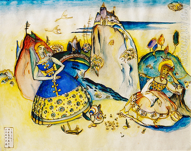 Poesie, Symbolismus, Schönheit, Russland, Märchen, Entartete Kunst, Fantasie, Fantasiewelt, Junge Frau, Tracht, Aquarell, Modern, Finnland, Schloss, Folklore, Brauchtum, Russische Avantgarde, Blauer Reiter, Expressionismus, Trachtenkleid, Russisches Märchen, Imatra, Südostfinnland, Südkarelien
