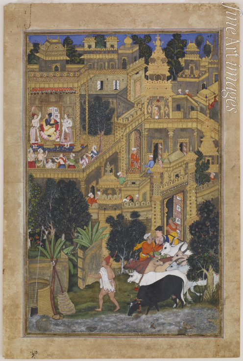 Persien, Indien, Handschrift, Buchminiatur, Buchmalerei, Manuskript, Bilderhandschrift, Mogulreich, Persische Literatur, Persische Miniaturmalerei, Islamische Kunst, Miniaturmalerei, Harivamsha, Harivamsa, Mahabharata, Indische Gottheit, Krishna, Dwaraka, Miniatur