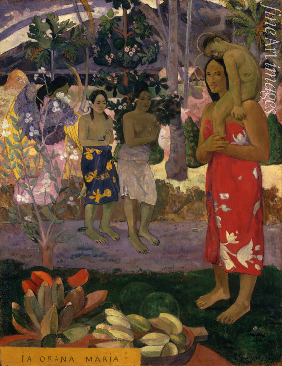 Tahiti, Cloisonismus, Südsee, Polynesien, Poesie, Paradies, Idyll, Tahitianerin, Madonna, Bibel, Engel, Neues Testament, Maria, Gottesmutter, Jesuskind, Heilige Familie, Christi, Jungfrau, Christuskind, Madonna und Kind, Krippe, Impressionismus, Marienbild, Impressionisten, Marienfigur, Madonnenbild, Marienbildnis