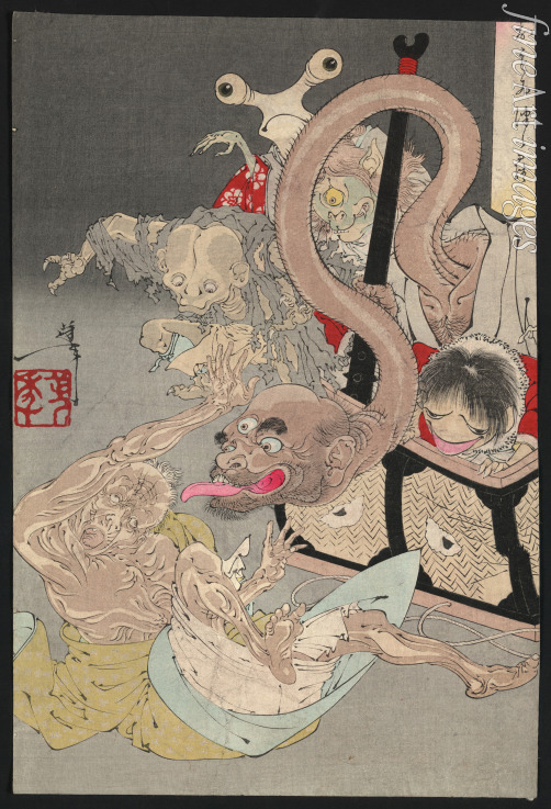Traum, Griechische Mythologie, Holzschnitt, Gutes und Böses, Geist, Drache, Japan, Edo-Zeit, Asien, Japanische Kunst, Fernosten, Ostasien, Dämonen, Dämon, Ukiyo-e, Seedrache, Büchse der Pandora, Pandora, Albtraum, Alptraum, Albdruck