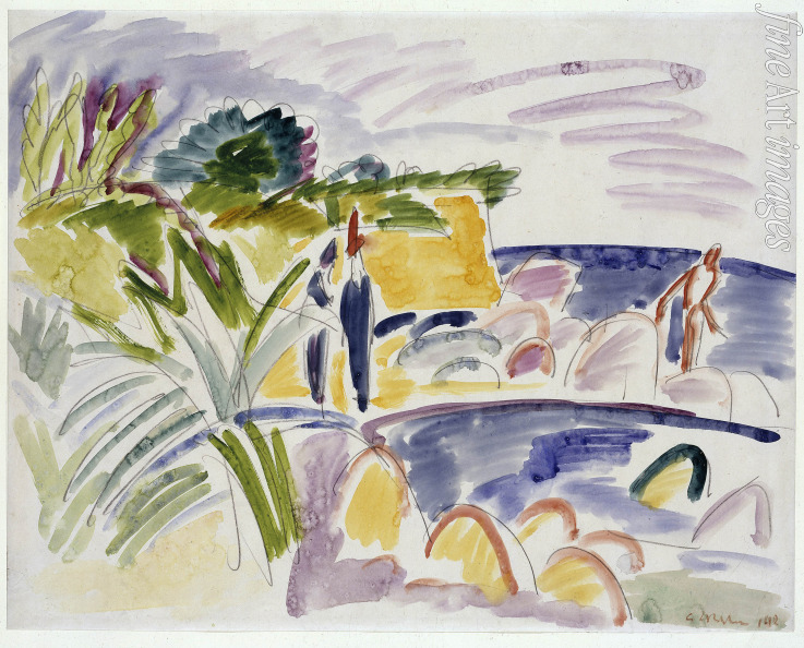 Sommer, Natur, Jahreszeiten, Poesie, Sommerlandschaft, Bäume, Licht, Farbigkeit, Brücke, Baden, Am Ufer, Am Wasser, Künstlergruppe Brücke
