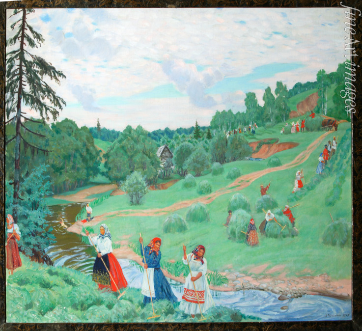 Sommer, Dorf, Natur, Sommerlandschaft, Bäume, Am Lande, Feld, Bauern, Bauernleben, Heu, Russland, Frauen, Tracht, Ernte, Erntezeit, Folklore, Erntearbeiter, Schnitterinnen, Heuernte, Volkskunst, Trachtenkleid, Mahd