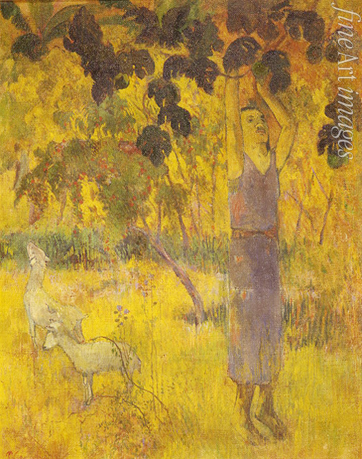 Tahiti, Cloisonismus, Südsee, Polynesien, Obsternte, Gelb, Sonnenlicht, Paradies, Mann, Am Lande, Idyll, Ernte, Erntezeit, Erntearbeiter, Impressionismus, Impressionisten, Ziege, Bock, Mann, die Früchte pflückend, Tahitier