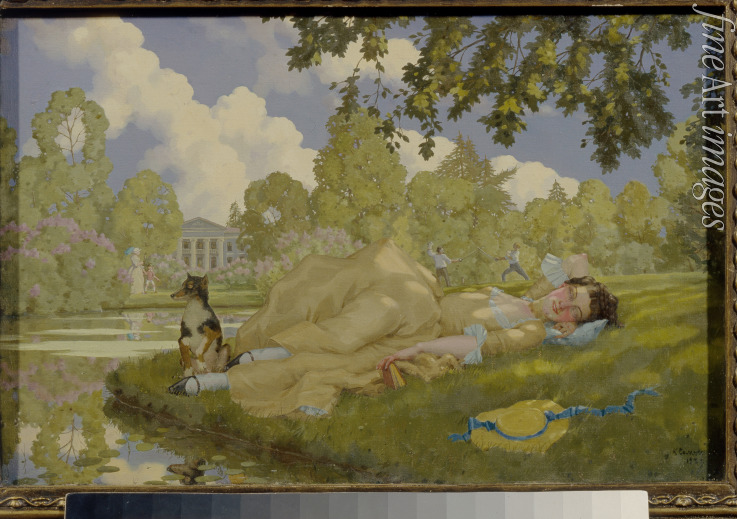 Sommer, Natur, Poesie, Bäume, Dame, Mädchen, Garten, Ufer, Park, Teich, Hügel, Russland, Schlaf, Traum, Junge Frau, Hund, Ruhe, Friede, Landgut, Herrenhof, Stille, Schlafende junge Frau, Schlafende Frau