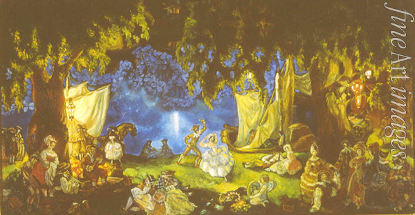 Tanz, Tageszeiten, Wanderleben, Fluss, Kabarett, Wasser, Ufer, Russland, Rast, Nacht, Schauspieler, Theater, Maske, Theaterstück, Zirkuskünstler, Komödie, Schauspielerei, Lustspiel, Wandertruppe, Schauspielerensemble, Mondlicht, Russisches Theater, Komödianten, Die Rast der Komödianten, Soudeikine, Soudeikin