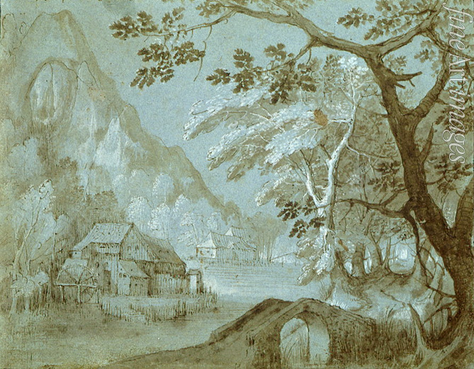 Sommer, Jahreszeiten, Poesie, Sommerlandschaft, Brücke, Berglandschaft, Berg, Wasser, Ufer, Hügel, Barock, Graphik, Zeichnung, See, Gebirge, Bergen, Baum, Landschaft mit Mühle am Bergsee, Mühle, Wassermühle, Bergsee, Flämische Malerei, Mühlenteich, Mühlteich, Mühlenweiher