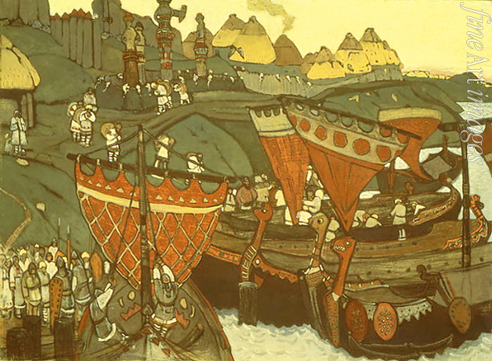 Fluss, Wasser, Ufer, Russland, Ukraine, Boot, Schiff, Siedlung, Russische Geschichte, Dnjepr, Segelschiff, Slawen auf dem Dnepr, Kiewer Rus, Slawe, Slawen, Siedler, Gemeinde, Gemeindeleben, Nicholas Roerich, Roerich, Rerich