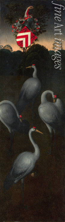 Kraniche mit Wappen der Familie Pagagnotti (Rückseite der Tafel eines Triptychons)