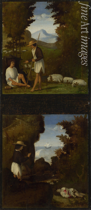 Szenen der Geschichte von Damon und Thyrsis. Thyrsis findet den Leichnam Damons