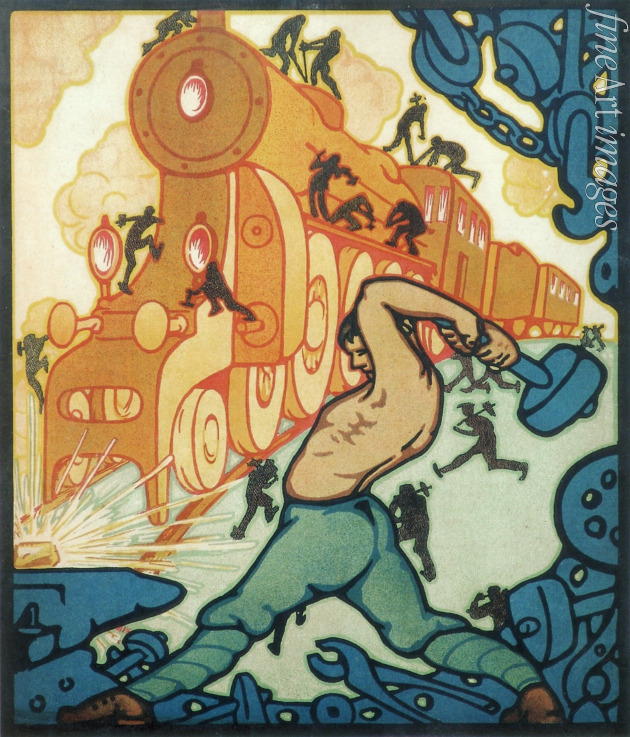 Russland, Proletariat, Arbeiter, Bahn, Eisenbahn, Zug, Sowjetische Agitations- und Propagandakunst, Sowjetunion, Propaganda, Dampflokomotive, Lokomotive, Agitation, Proletarier, Wirtschaft, Industrialisierung, Aufbau der UdSSR, UdSSR, Sozialistischer Realismus, Sozrealismus, Geschichte der Eisenbahn, Technikgeschichte, Verkehr, Verkehrsgeschichte, Triebfahrzeug, Dampflok, Fünfjahresplan, Stoßarbeit, Stoßarbeiter, Stoßarbeiterin, Helden der Sozialistischen Arbeit, Bahnreise