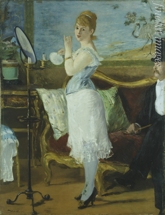 Morgen, Dame, Tageszeiten, Interieur, Spiegel, Toilettentisch, Nachthemd, Alltag, Genreszene, Nana, Emile Zola, Morgentoilette, Zola, Negligé, Negligée, Morgenmantel, Boudoir