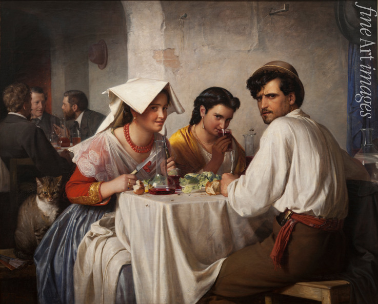 Tageszeiten, Am Tisch, Romantik, Schönheit, Trinken, Wein, Schenke, Italien, Junge Frau, Tracht, Genreszene, Weinkrug, Folklore, Tradition, Weinlokal, Brauchtum, Italienerin, Italienischer Mittag, Trachten look, Osteria