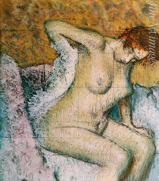 Morgen, Pastell, Nackt, Nacktheit, Licht, Farbigkeit, Dame, Nackte Frau, Am Bett, Körper, Schönheit, Impression, Badende, Bad, Toilette, Nachthemd, Akt, Impressionismus, Impressionisten, Nach dem Bade, Negligé, Negligée, Morgenmantel, Badezimmer, Boudoir