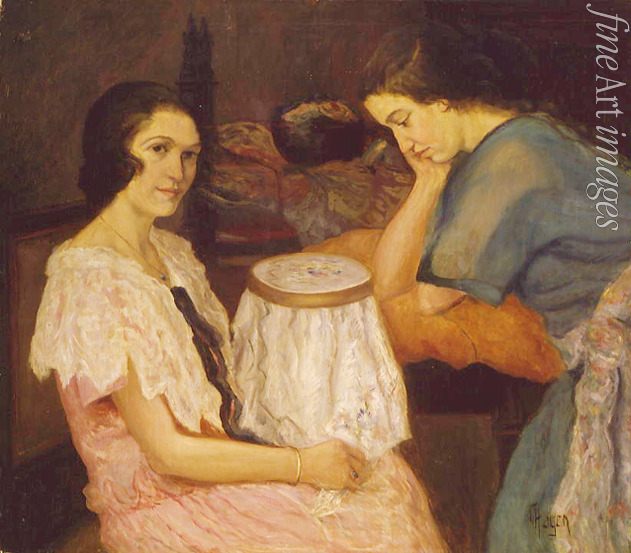 Junge Frau, Familienleben, Alltag, Stickerin, Stickerei, Deutsche Kunst, Nähen, Näherin