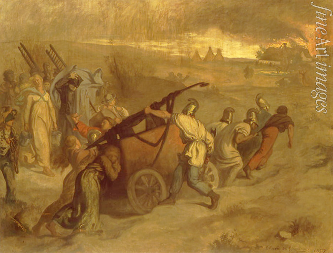 Frankreich, Pferde, Einsatz, Brand, Brandstätte, Besatzung, Feuerwehr, Dorffeuerwehr, Feuerspritze, Feuerwehrleute