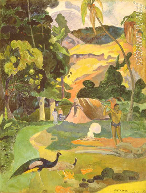 Sommer, Tahiti, Cloisonismus, Südsee, Polynesien, Natur, Jahreszeiten, Poesie, Sonnenlicht, Sommerlandschaft, Hain, Bäume, Tal, Paradies, Licht, Farbigkeit, Berglandschaft, Idyll, Berg, Tod, Urwald, Romantische Landschaft, Landschaft mit Pfauen, Holzfäller, Impressionismus, Impressionisten, Tahitier
