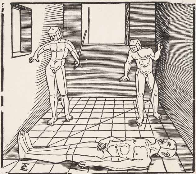 Drei männliche Figuren in einem Raum (Aus: Unnderweissung der Proportzion)