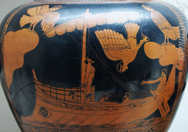Vase, Schönheit, Nymphe, Griechische Mythologie, Schiff, Odyssee, Homer, Held, Nymphen, Odysseus, Ulixes, Sage, König von Ithaka, Griechische Antike, Ilias, Trojanischer Krieg, Mänaden, Flotte, Krater, Wasserwesen, Nereide, Sirenen, Quellnymphe, Mänade, Najade, Najaden, Gefäß, Kelchkrater, Keramik, Sirene, Etrurien, Handelsschiff, Etruskisches Handelsschiff, Vasenmalerei, Attische Vasenmalerei, Rotfigurige Vasenmalerei, Rotfigurige Keramik, Rotfiguriger Stil, Attika